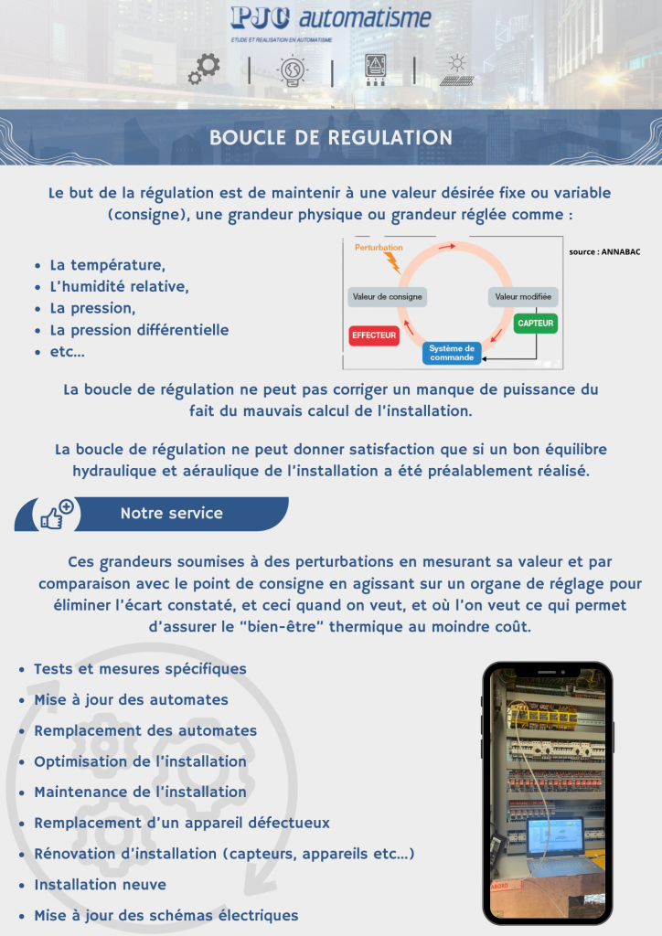 Ces grandeurs soumises à des perturbations en mesurant sa valeur et par comparaison avec le point de consigne en agissant sur un organe de réglage pour éliminer l’écart constaté, et ceci quand on veut, et où l’on veut ce qui permet d’assurer le “bien-être” thermique au moindre coût.